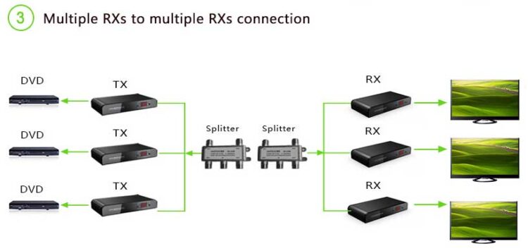 - It is easy to build one-to-many and many-to-many video matrix or one TX to one RX connection by using of CATV splitters